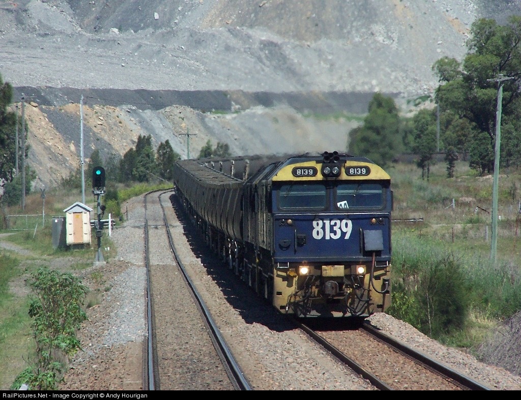 The elderly EMD products of 8139 and 8140 lead an empty coalie thru Glennies Creek in the Hunter Valley.The open cut coal mine of Camberwell is in the background