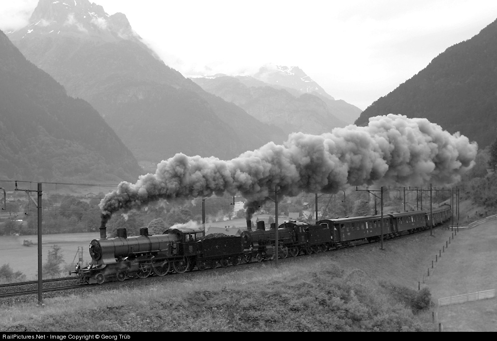 | In 2004 it was 100 years since fourcylinder-compound steamlocomotive A 3/5 (4-6-0) 705 was built by SLM. Together with B 3/4 1367 from 1916 she pulled a train over the Gotthard line, unfortunately on a rainy day, but so the exhaust was very impressive. |