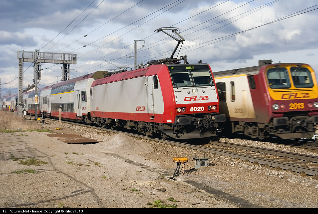 | CFL 4020 with bilevel passenger cars leaves Berchem station towards Athus (Belgium) while a railcar towards Luxembourg city passes on the opposite track. |