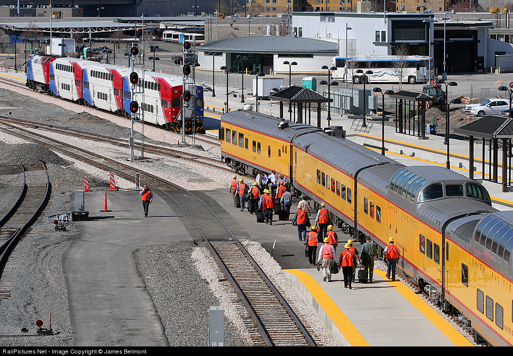 A group of Union Pacific employees gather on the platform of Salt Lake City's new passenger terminal while a UTA FrontRunner commuter rail test train departs for Ogden.