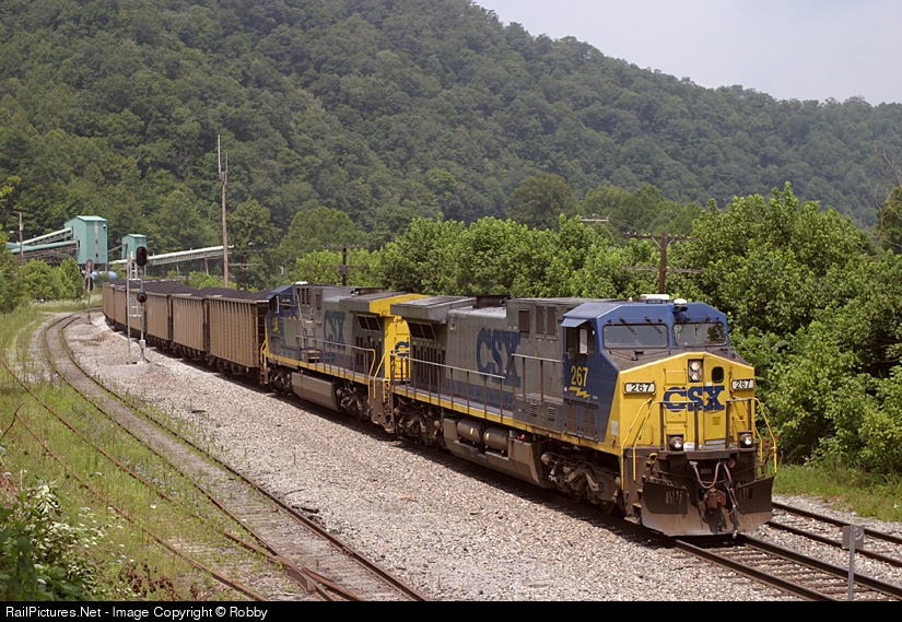 | After a power swap at Shelby, CSX 267 leads an Extra South past the idled McVicker Mine on the Big Sandy Sub on a typical hot and hazy summer afternoon. |