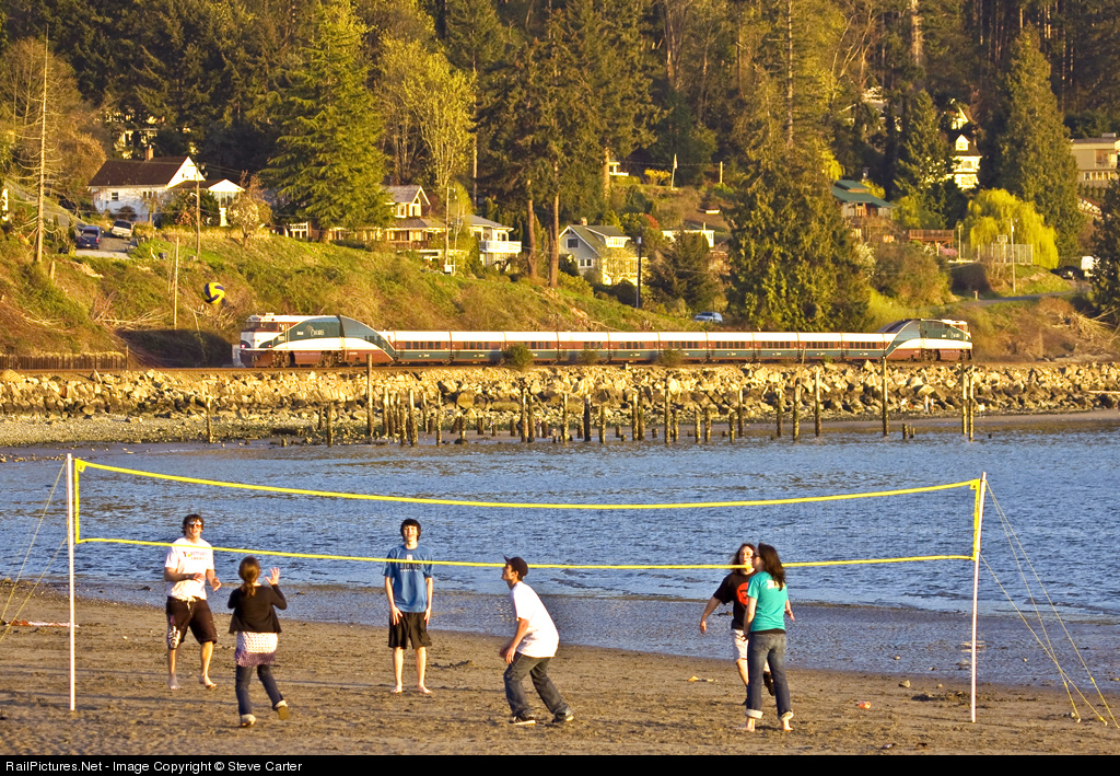On the first real nice weekend of the season, people are enjoying the low tide beach at Picnic Point. This group is among the more responsible, picking a game of volleyball to play rather than chicken with the trains. Now all this Cascades train has to do is avoid the volleyball.