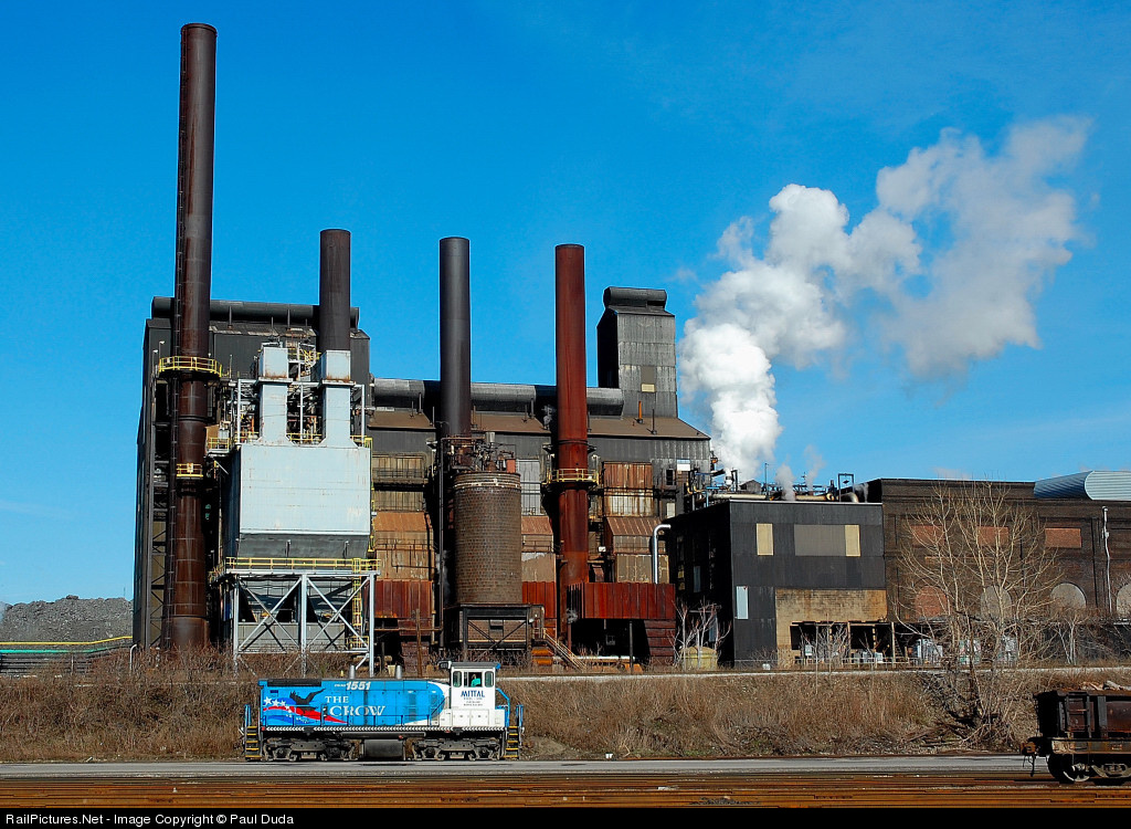 | A CROW switcher runs through the yard to find its train. It's impressive how small the train looks next to the factories that once dominated this town. Now, this is only a small portion of what is left. |