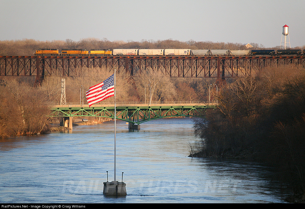 | LTZ 56 creeps across the high bridge at Ft. Dodge at 10 mph. Built in 1901 for the Chicago Great Western this bridge sits 182 feet over the Des Moines River. The local is heading back to Eagle Grove, IA after making a Calendar Yard turn today. |
