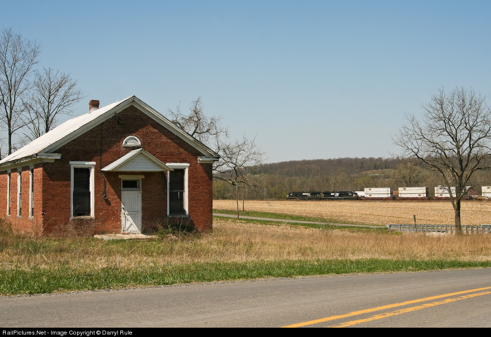 | Long after the final class has been dismissed, a one-room school house silently watches another train roll by. One can imagine a child at this school in the 1930s and 40s watching endless strings of K4s and M1s thundering by the window. |