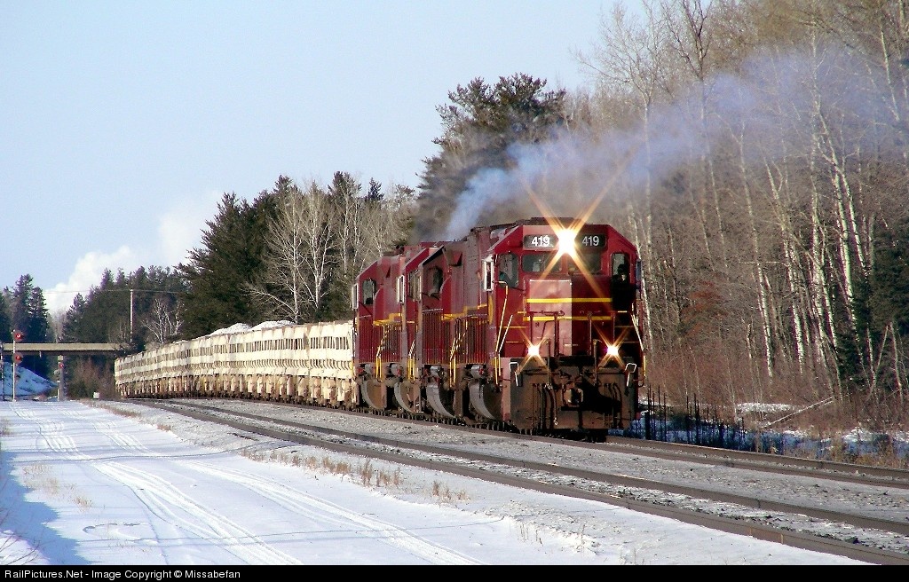Retired DMIR 419 leads a four unit Missabe maroon consist on an afternoon limestone train from Minntac. The cold temps prevented some of the cars from dumping at Minntac so they will be returned to Duluth. Tough if not impossible to find Missabe maroon