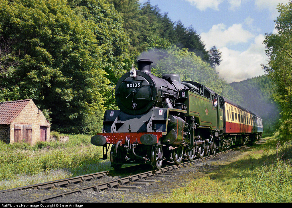 It was a very hot and humid day deep, deep in Blansby Forest, far from any (legal) road access. BR 'Standard' 2-6-4 tank No.80135 glides effortlessly towards Pickering. The attractive forester's hut has long since gone and although the livery 'mix' is not to all tastes, the elegant proportions of Riddles' design cannot fail to impress.
