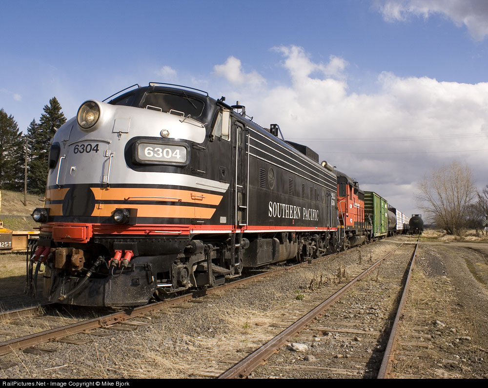 | This may be a wedge shot, but how many wedgies do you see with an FP9 painted in Southern Pacific coupled to a GP30? The W&I pauses in Belmont to pick up a tank car that Procor wants back. |