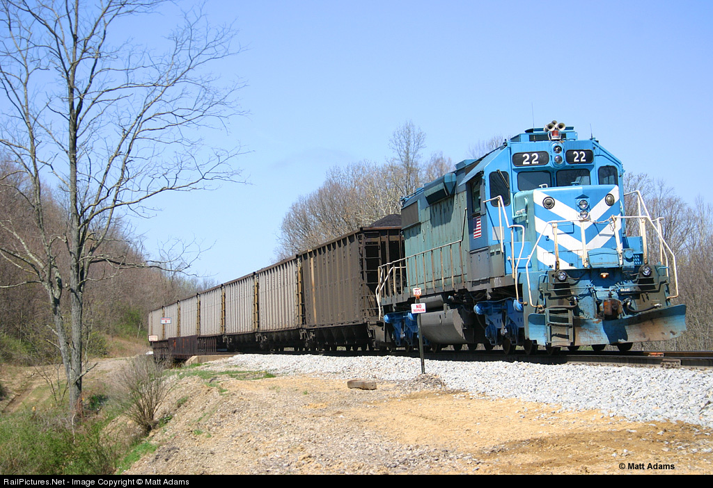 | Former Yankeetown Dock SD38-2 22 leads the Cumberland Mine loaded coal shuttle eastbound at MP 10.5. Both units now wear a scheme similar to the one that US Steel, previous owers of the line, had the engines painted. |