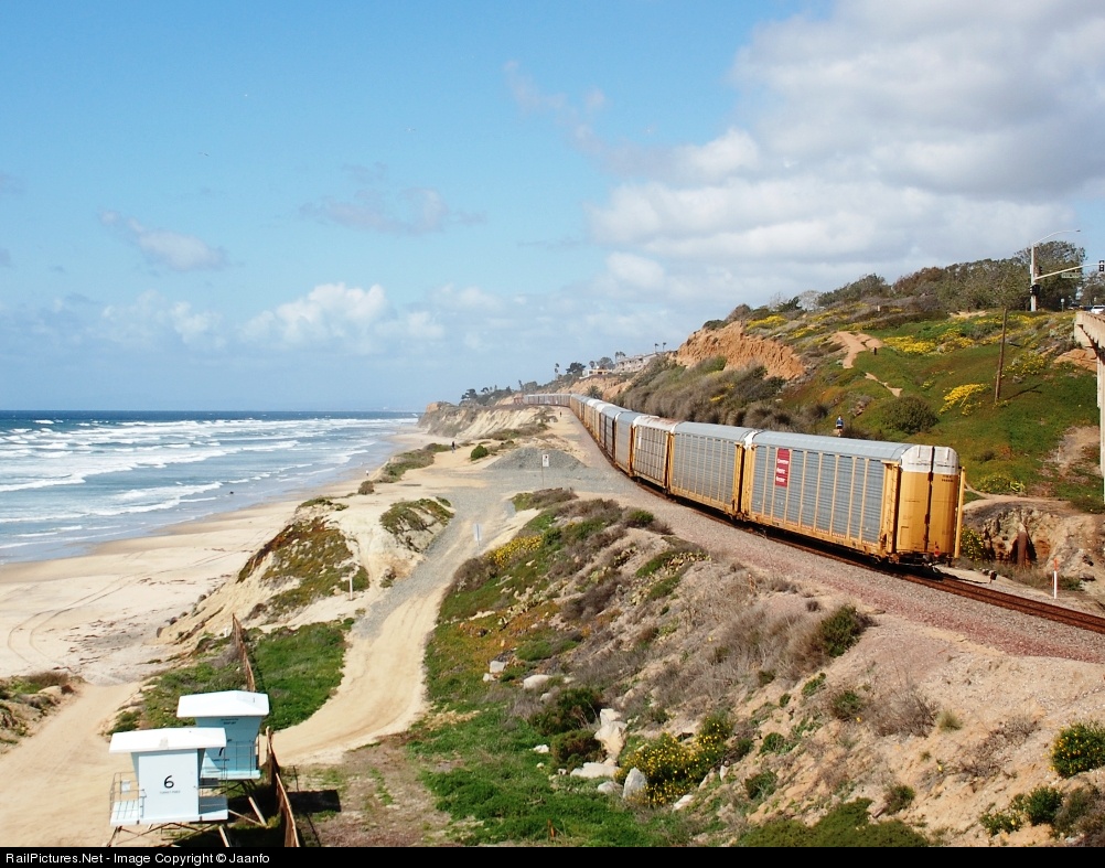 Westbound Autorack unstretches itself along the Del Mar Bluffs