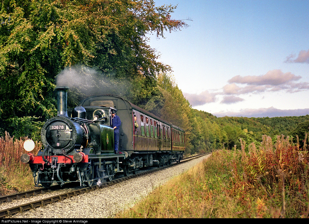 The fifty diminutive 'Terriers' of the London, Brighton & South Coast Railway have a fascinating and convoluted history. Examples of the class, introduced in 1872, worked for the GWR, L&SWR the War Department, the Isle of Wight Central Rly, the Edge Hill Light Rly and the Weston, Clevedon & Portishead Rly. Several soldiered on with BR until November 1963 and no less than ten survive in preservation. Here amidst the autumn gold is 32678 from 1880.