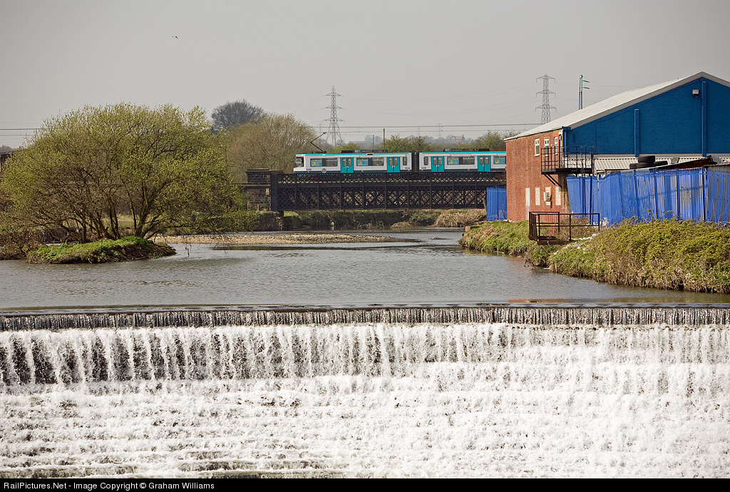 A Metrolink Tram crosses the River Irwell at Warth, Radcliffe, on its way to Altrincham. The weir was built many years ago to lower the river to pass under a main road.