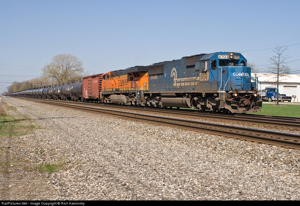 | An ex Conrail SD60 now known as NS 6703 leads a unit ethanol train slowly down the 10mph controlled siding through Olmsted Falls, Ohio |