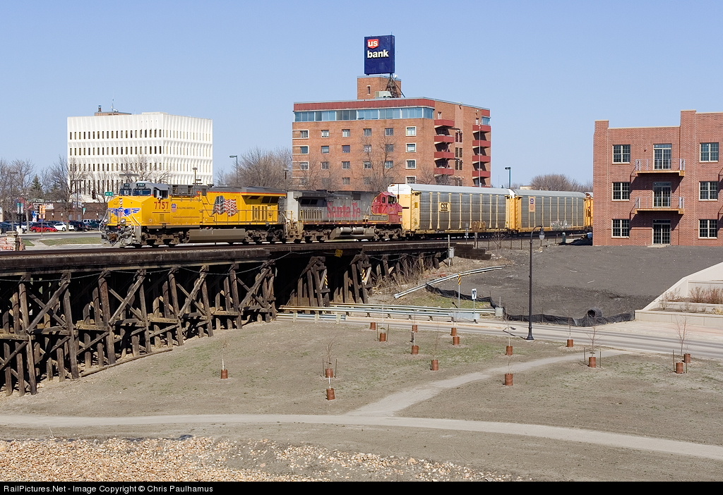 UP flag unit leads a vehicle train west out of Moorhead, MN and into Fargo, ND on a perfect Saturday afternoon. Since Fargo-Moorhead went whistle-free, it's a little more challenging to railfan here as the only head's up that a train is on the move, aside from a scanner, is when the crossing gates activate! More info about this area at Grand Forks Railfanning.