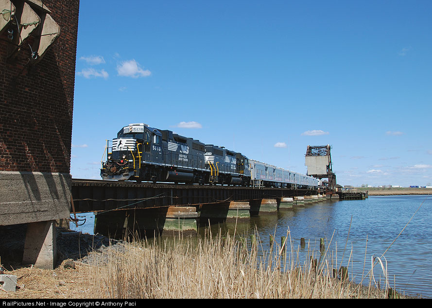 | In a rare daylight move, the Ringling Brothers and Barnum & Bailey Circus train stock cars and flats are pulled across the Hackensack River for Croxton Yard. |