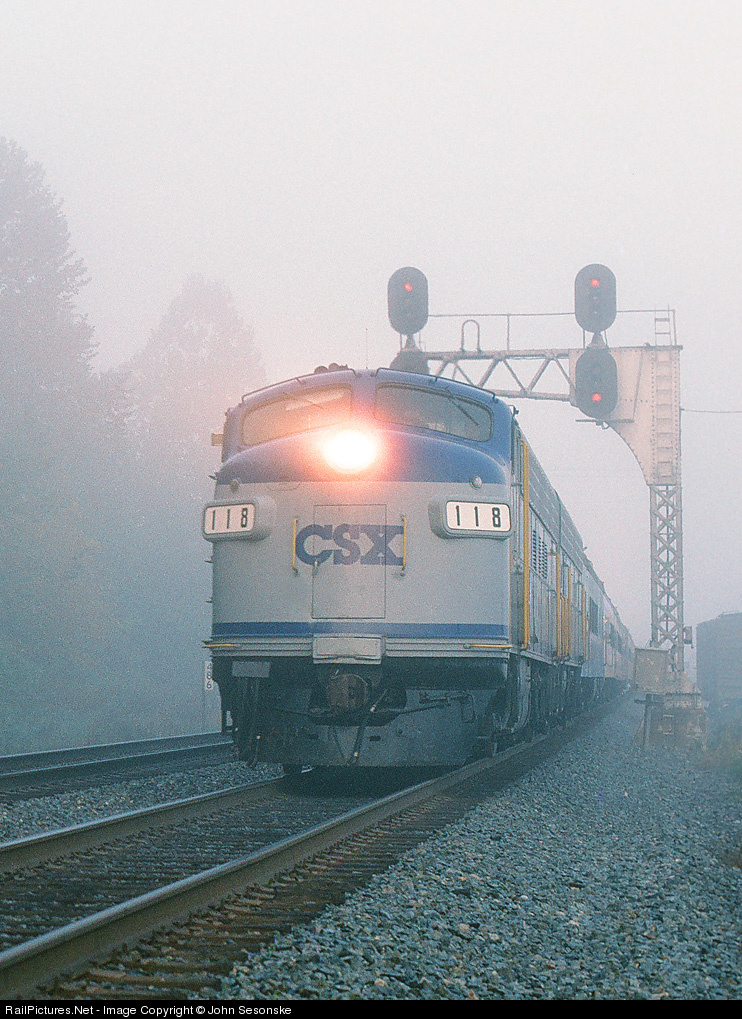 | The 1989 version of the New River train (Huntington, WV to Hinton, WV) is EB a few miles out of Huntington and running thru heavy Ohio River fog as it passes under a classic C&O cantilever signal at MP 486 (milepost just to left of pilot). The power for the 1989 train was CSX FP7 #118 and CSX F7B #119. CSX #118 started life in 1952 as Clinchfield #200 and is currently West Virginia Central (Western Maryland) #67. |