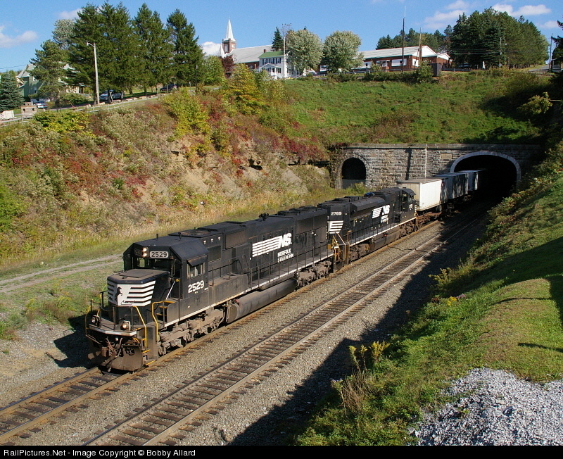 | With it's Nathan P5a blaring, 2529 storms out of the Allegheny Tunnel with a trailer train on a beautiful fall afternoon in October. |
