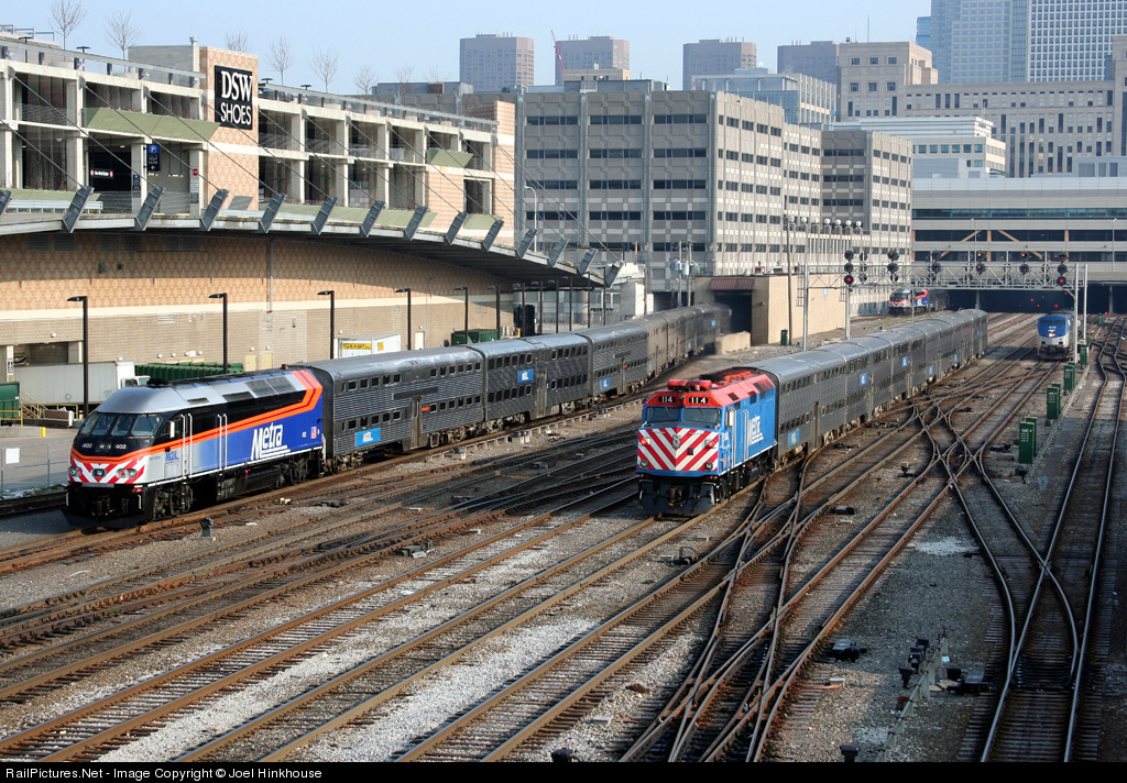 | Passenger locomotives from 3 builders: MPI MP36's file through the wash on the left. An EMD F40PH pushes into Union Station. And a pair of GE P42DCs shuttle around to connect to a train. |