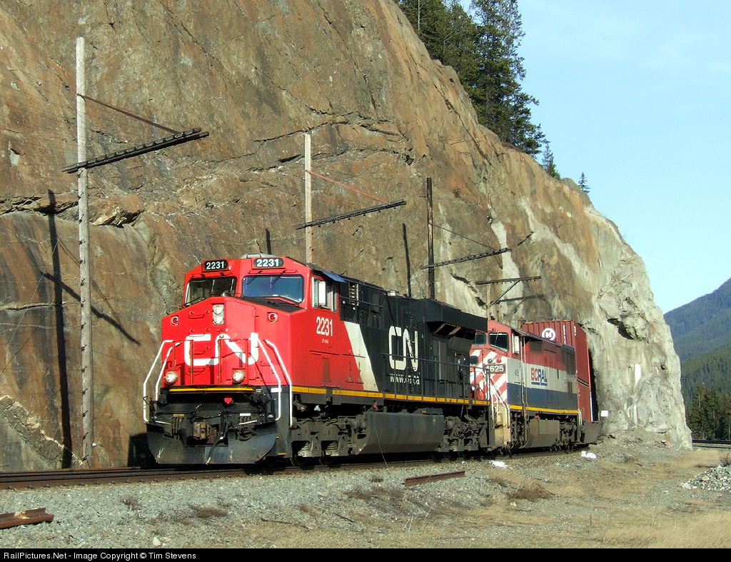 CN 2231 and BCOL 4625 lead 12,000 feet of containers westward.