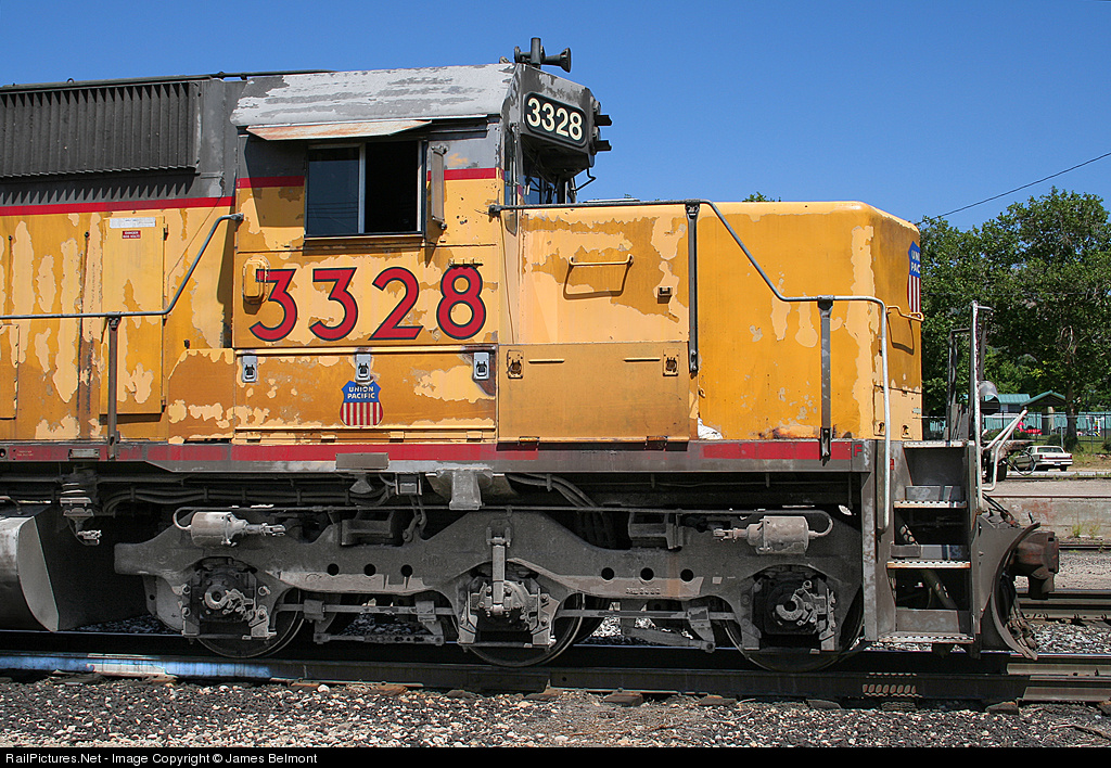 On a brilliant Summer Solstice afternoon in 2006, Union Pacific SD40-2 #3328 is showing it's age. As a 1976 graduate of EMD, it was built with 80 mph gearing as UP 8058. By Sept. 1981, the unit was regeared making it just another SD40-2 among UP's fleet of 685 units.