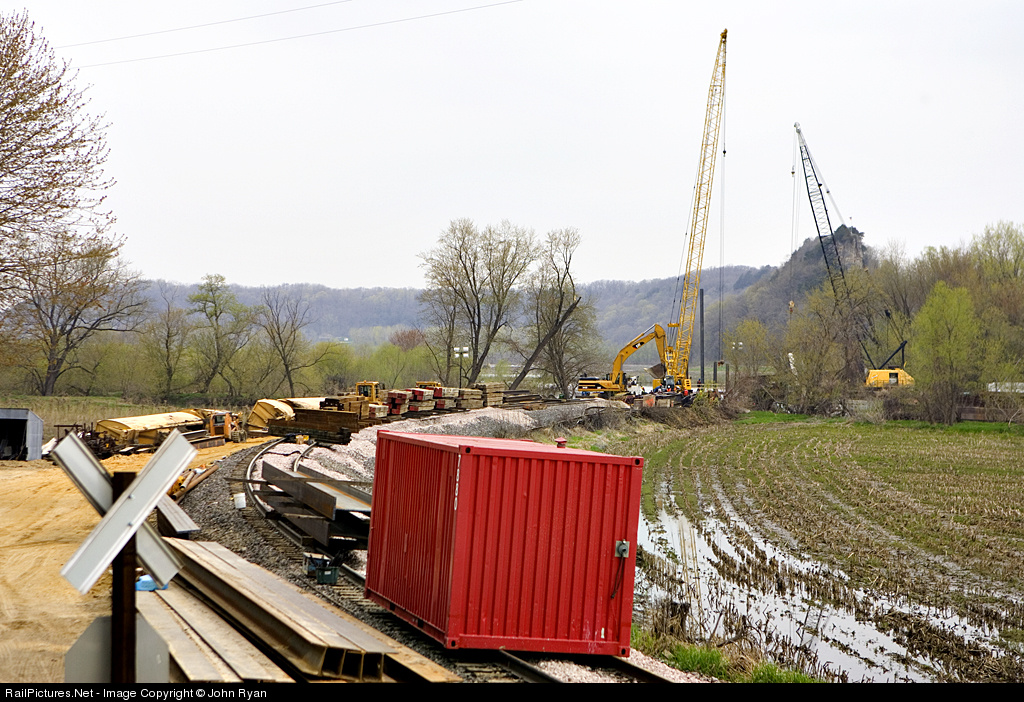 All the supplies required to rebuild the Turkey River bridge are stacked along the mainline. In the distance you will note what appear to be metal pilings driven into the river bed. There are also two large girders in the foreground that may be part of the new bridge.