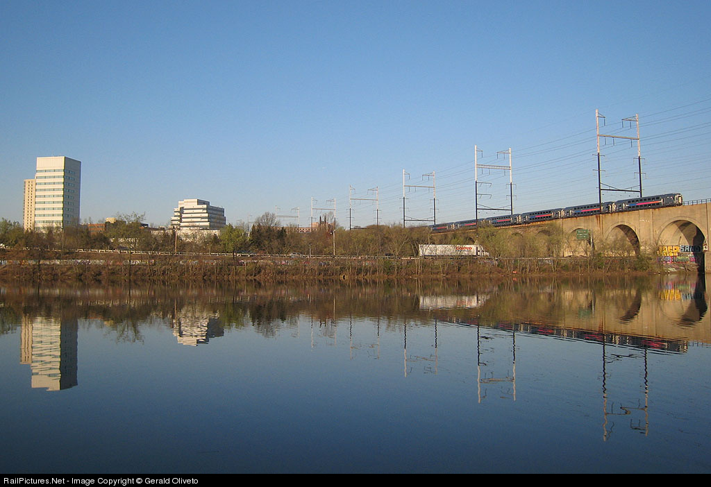 | Leaving the 'Hub City' of New Brunswick behind it, a train of new Multi-Level coaches crosses the Raritan River en route to New York City. New Brunswick's 'Hub City' nickname comes from its role as the terminus of various transportation forms throughout the years. |