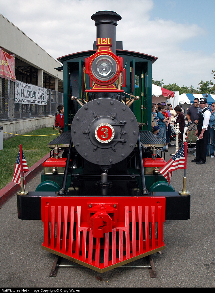 Disneyland Railroad 2-4-4T #3, the "Fred Gurley," was built by Baldwin Locomotive Works in 1894 as an 0-4-4T for the 3' gauge Godchaux Sugar Company (Louisiana) #1. It was acquired by the Santa Fe & Disneyland in 1958 and rebuilt to its current configuration. Fred Gurley was the president of the Santa Fe, which sponsored Disneyland's railroad, when the park opened in 1955. It is seen here on display at Fullerton Railroad Days.