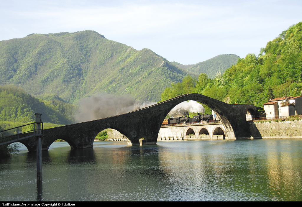 740+741 Franco Crosti at the Ponte della Maddalena ( called the devil bridge ) in front of a special train.