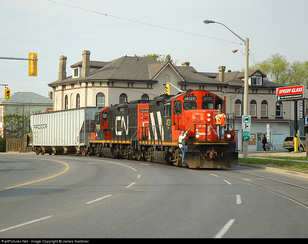 | taking it to the street, a pair of CN Geeps are required to move 580's train of one covered hopper at the end of a long work day. |