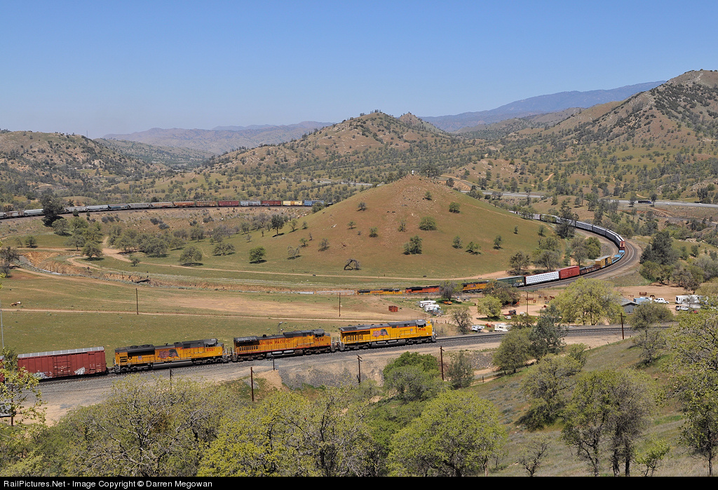 | This massive UP manifest struggles through the Tehachapi Loop at 12mph as it works toward the summit at Tehachapi. UP 1996 was the second unit in the helper set, and can be seen emerging from the cut above the lead unit. |