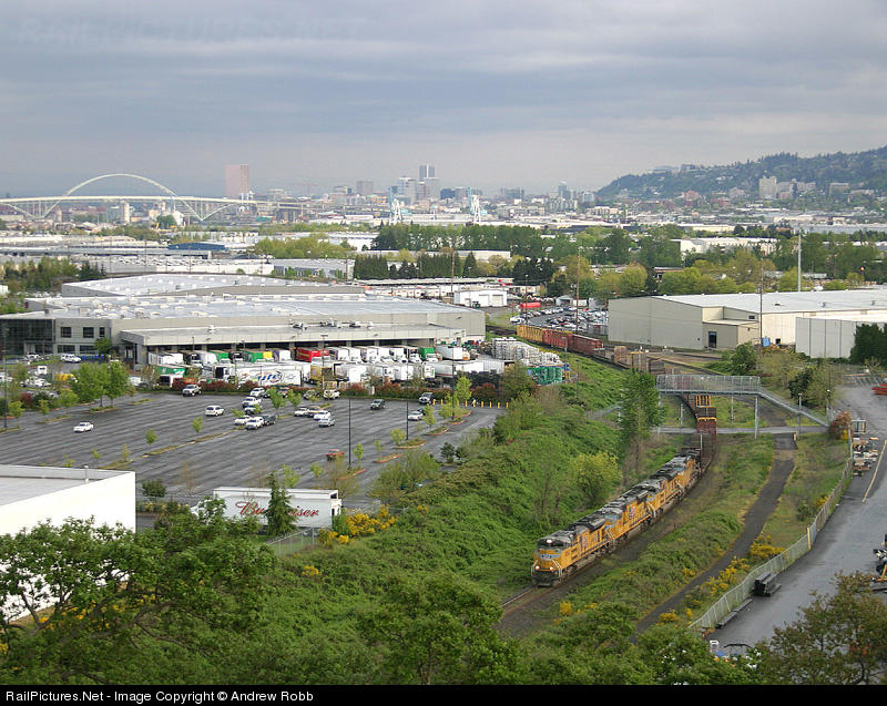 | An Eastbound Albina train heads east just as the sun begins to break through a thin layer of cloud after a cloudy and drizzly day in Portland |