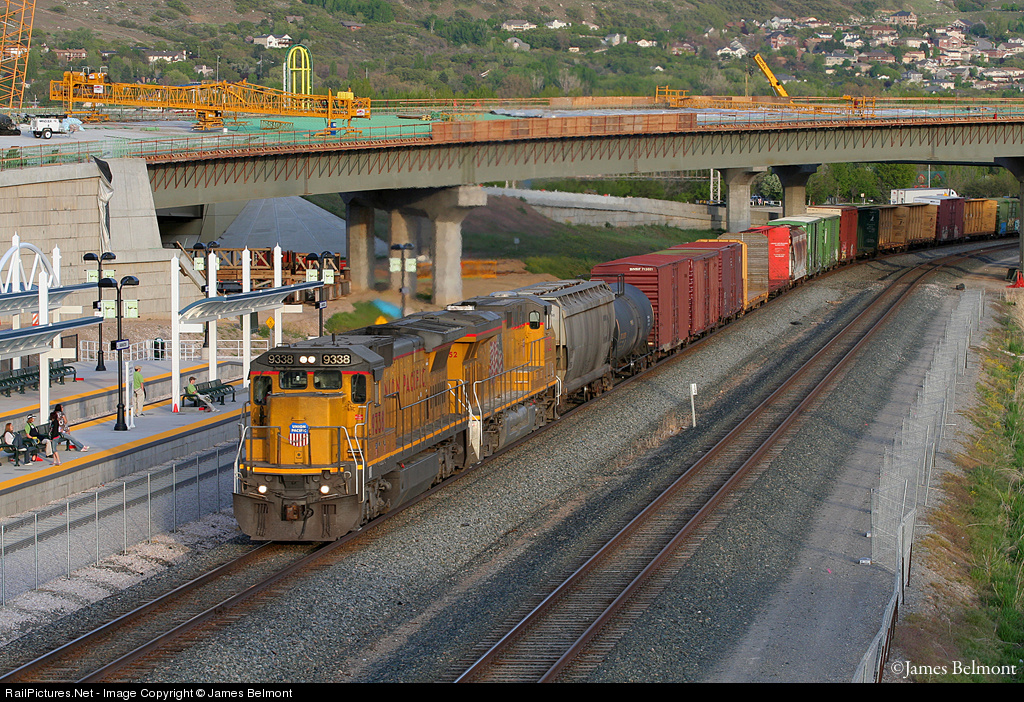 UP's fleet of GE C40-8's rarely lead mainline freights, at least not in Utah. Here UP 9338 (blt. in Feb. 1989) does the honors, leading an eastbound freight while passengers await the arrival of the next FrontRunner train to Ogden.