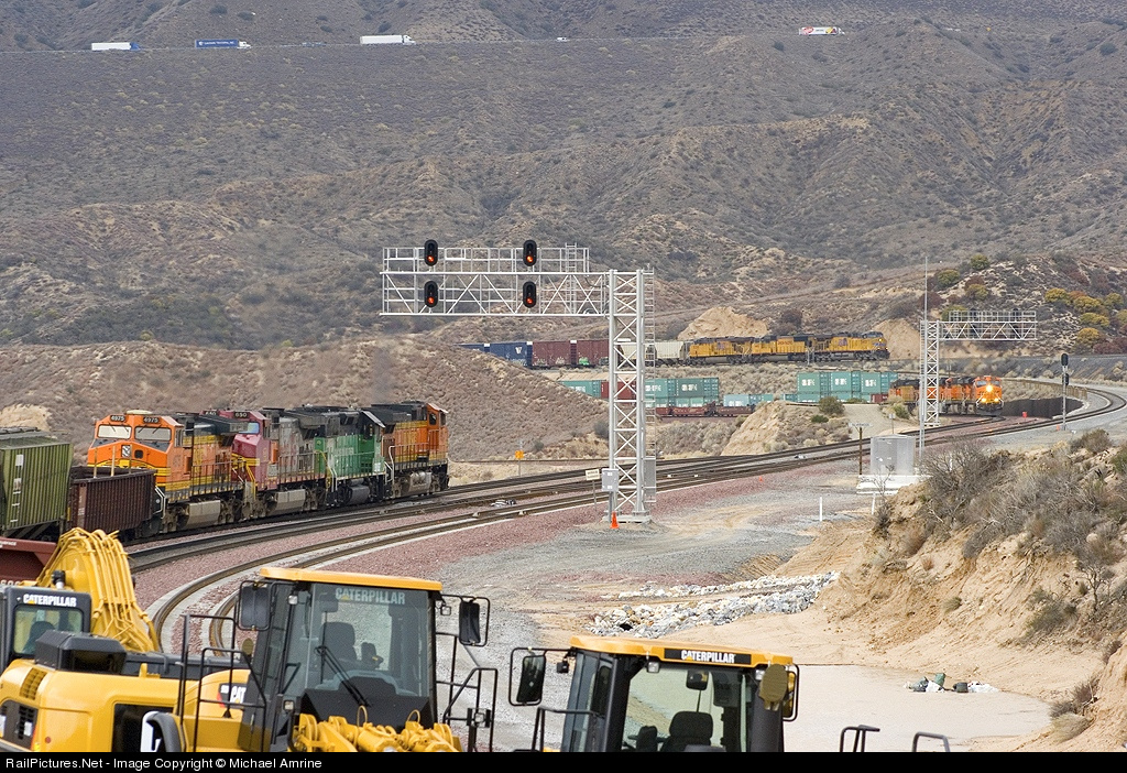 | A westbound rounds the curve out of Summit, an eastbound crests the grade while above them both a UP northbound passes on the ex-SP Palmdale Cutoff. |