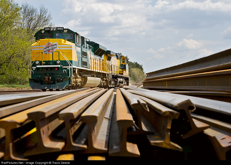 | Some of the rail that is framing my shot of UP 1995 and CNW 8701 in this pile dates back to 1894. These two units were brought to Altoona, WI for the 2008 Chicago & Northwestern Historical Society meet in Eau Claire, WI. Soon, three coach buses filled with members will be here for an upclose look. (note the one broken rail. The other end of the pile has all the other broken ends) |