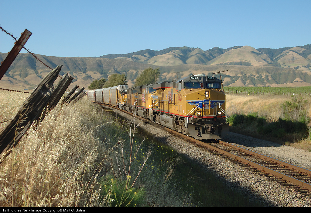 | After picking up a string of auto racks and a helper engine to take south this UP manifest passes through the vineyards in the Edna Valley, south of San Luis Obispo. |