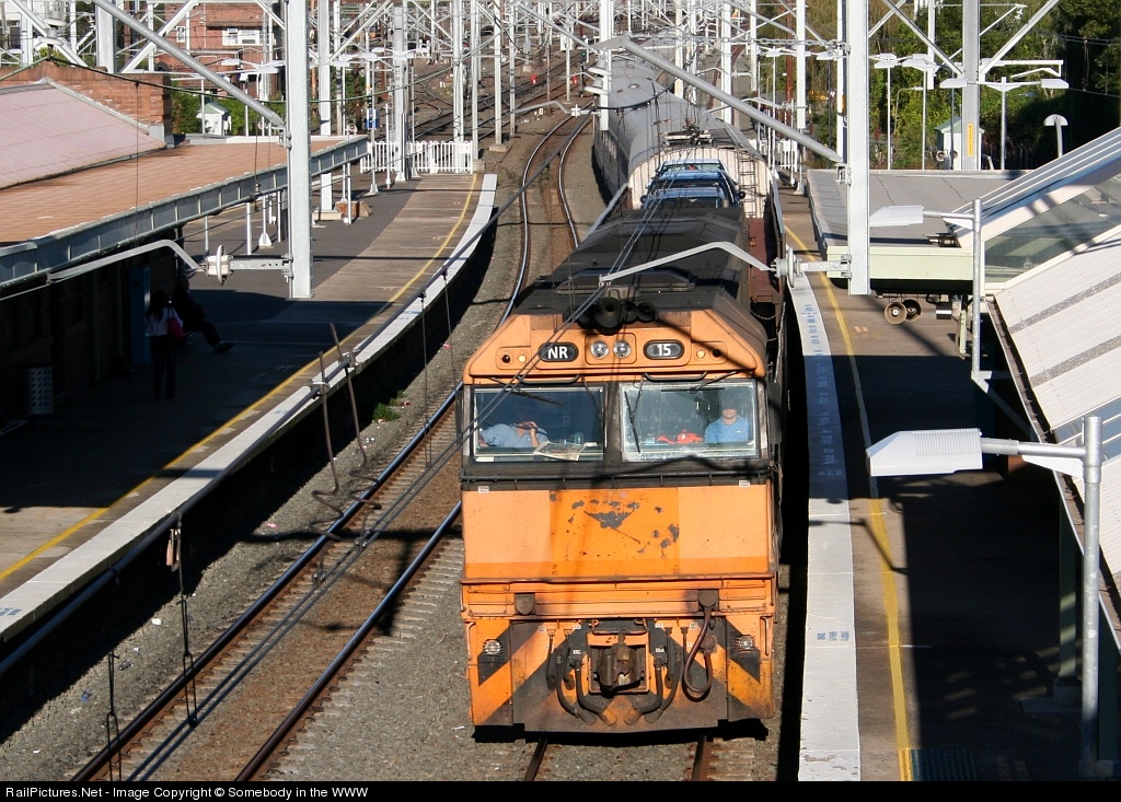 | A grubby looking normal liveried NR leads the westbound Indian Pacific to Perth through Clyde in Western Sydney, 20km into it's transcontinental journey via the Blue Mountains. Visible behind the train is a jungle of overhead wiring at the entry to Clyde Yard. |
