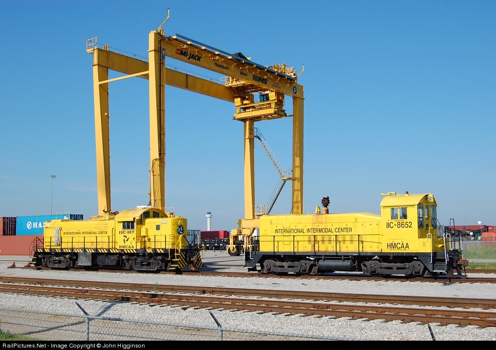 | EMD SW900 8652 and Alco RS-1 107 pose next to a gantry crane at the Huntsville - Madison County Airport Authority's International Intermodal Center, where containers are marshaled onto different forms of transportation depending on where they need to go. NS has a branch line which serves the facility. The control tower of the Huntsville International Airport can be seen in the distance between the two locomotives. |