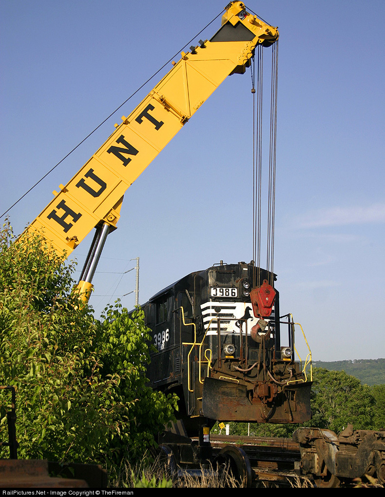Hey Dad, look what I caught! Is it a keeper? An elderly GE gets a lift to slide a set of repaired trucks under it.