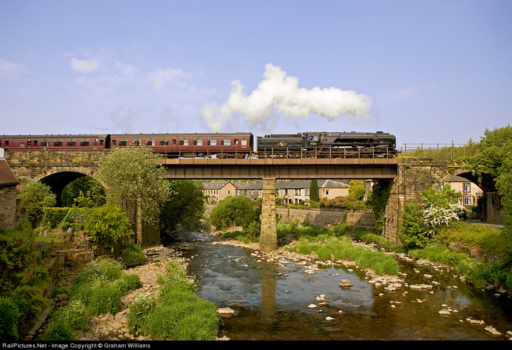 | Today was another (rare) sunny day in the NW of England as BR 9F no. 92214 works the first midweek train of the morning from Bury to Rawtenstall. It is seen here on Brooksbottom Viaduct crossing the River Irwell in the village of Summerseat. |