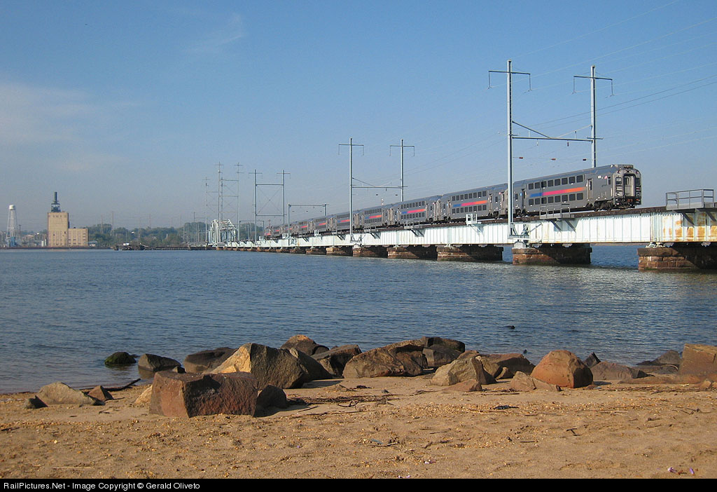 A sleek nine car set of NJ Transit's new Multi-Level coaches glistens in the Spring sun as it sails across the Raritan River on the North Jersey Coast Line.