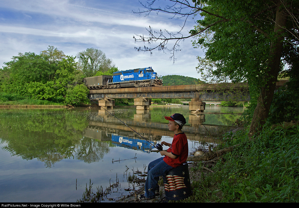 Youngster is more concerned with hooking a big one than the SD40-2 howling in full dynamic crossing beside him.