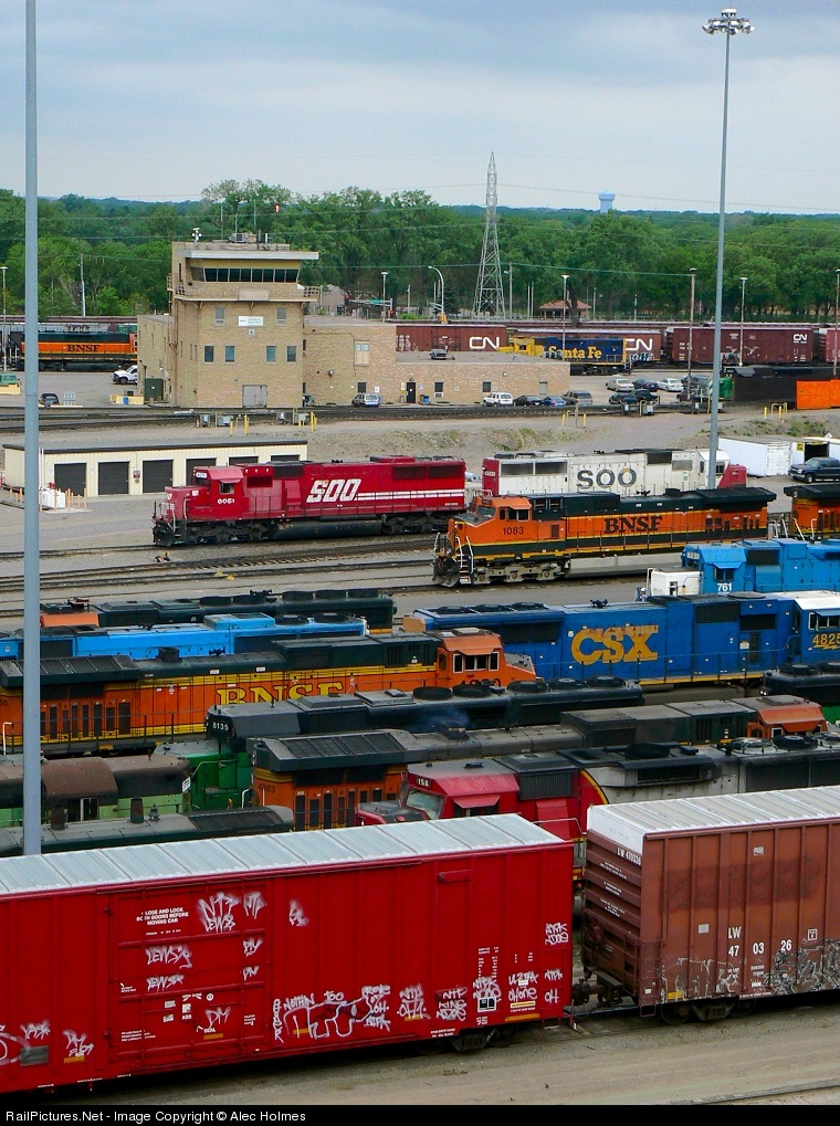 | Quite the view of the Diesel shop area and bowl in this image. The Shoreham SOO transfer runs past the hump tower, with plenty of power variety in the foreground. |