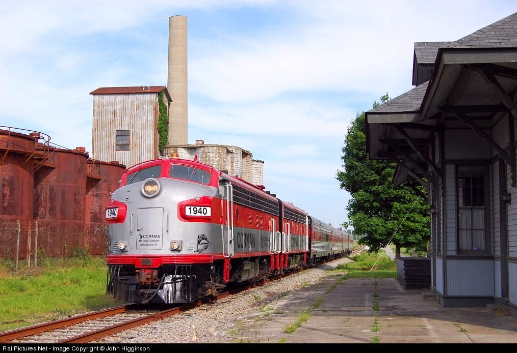 RJ Corman's F-units lead the My Old Kentucky Dinner Train through the quaint community of Deatsville as they make their way from Bardstown to Clermont.