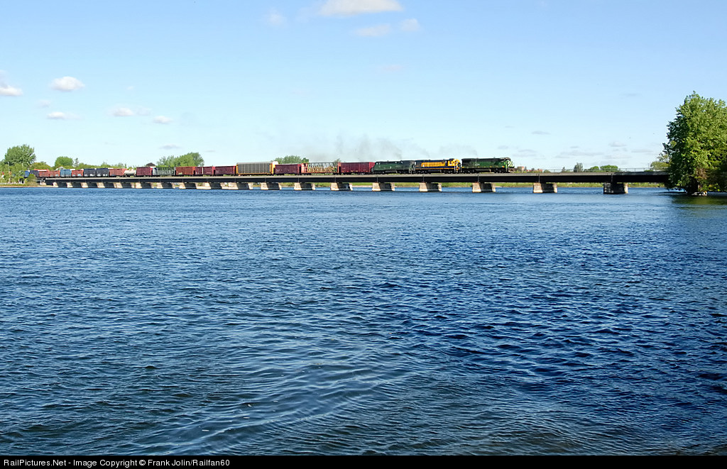 A wide-angle shot on MMA 5026 South as it crosses the Richelieu River at sunrise. Bound for Millinocket, Maine, train # 2 began its journey at CP St-Luc Yard in Montreal.