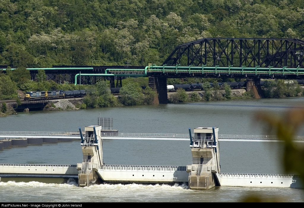 Q389 is seen here passing the URR bridge and the Mon River locks.
