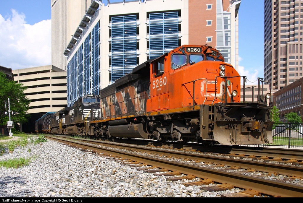 | NS 184 with CN power on the lead heads out of the tunnel, and over the pedestrian crossing on the NS Dayton district, in downtown Columbus. |
