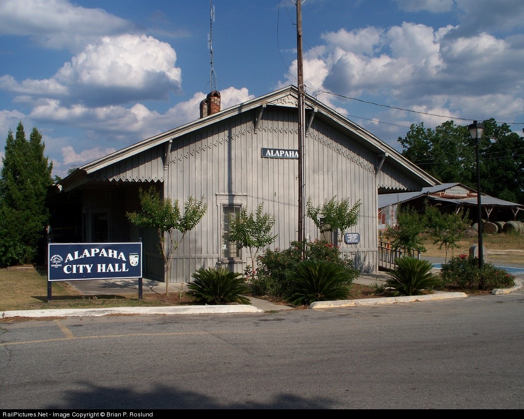 The former Brunswick and Albany Railroad station still stands in Alapaha, Georgia. Although the tracks were removed in 1985 the station remains, serving as Alapaha's City Hall.
