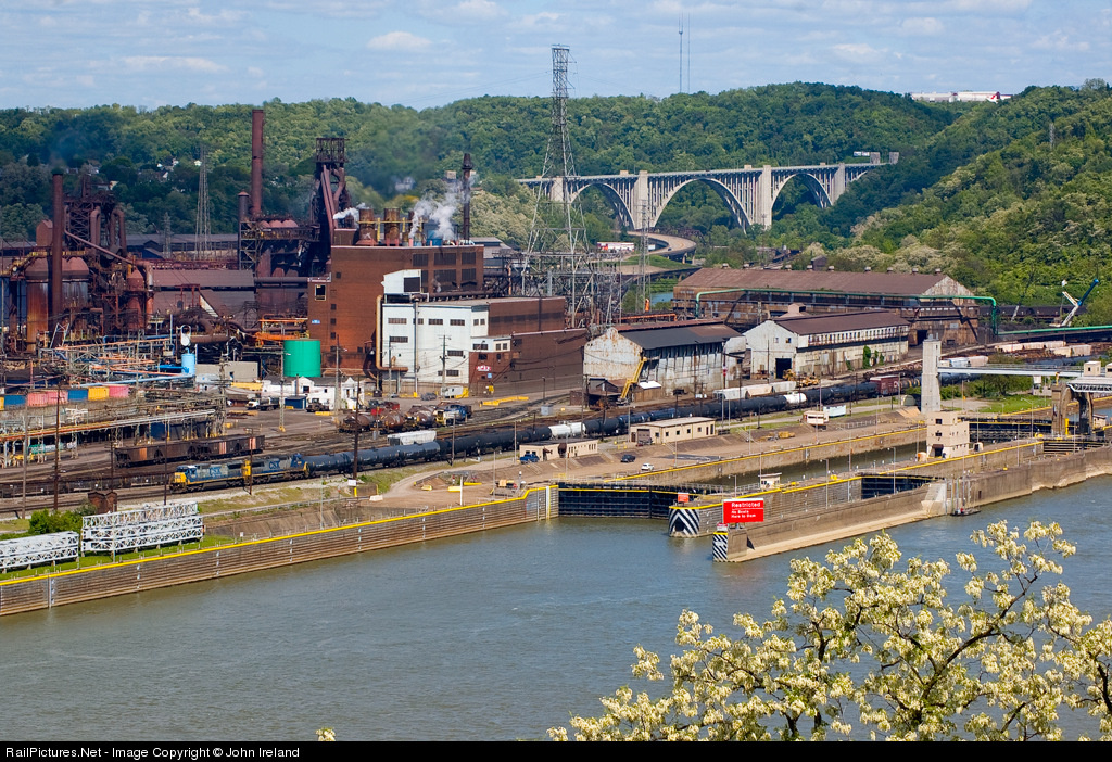 | 389 passes the massive ET works. Despite CSX's obvious close proximity to the steel mill, the railroad does not directly service the mill. That duty is left up to the Union Railroad and US Steel's own inhouse railroad, a few units of which can be seen just above Q389 along with some hot metal cars. |
