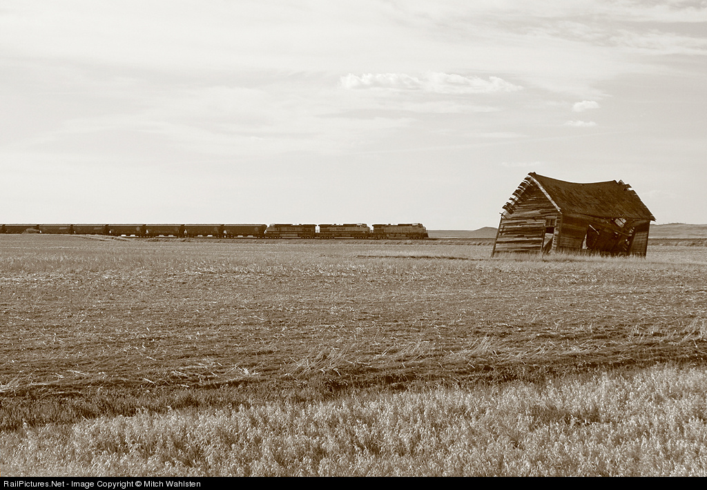 An empty grain train going to Emery, SD for reloading passes by an abandoned, "dancing," farmhouse on the outskirts of Bowman on former Milwaukee Road trackage.