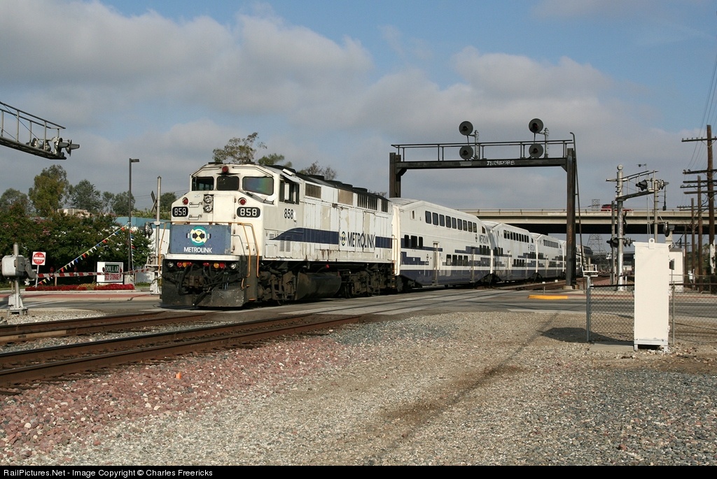 A Metrolink heads under the classic ATSF signal bridge at the East End of DT Junction, and the 605 Freeway, while I wait with some other fans for #3751. This is MP 152.1, where the ex-SP Puente Branch crosses the BNSF on a diamond. DT also includes crossovers between the two main tracks. The name DT dates to when this was also a transition from single track to double track (DT). The train is the first weekend inbound of the day, and runs from Oceanside to LA. F59PH #858 is from the first F59PH order ever, in the Summer of 1992.